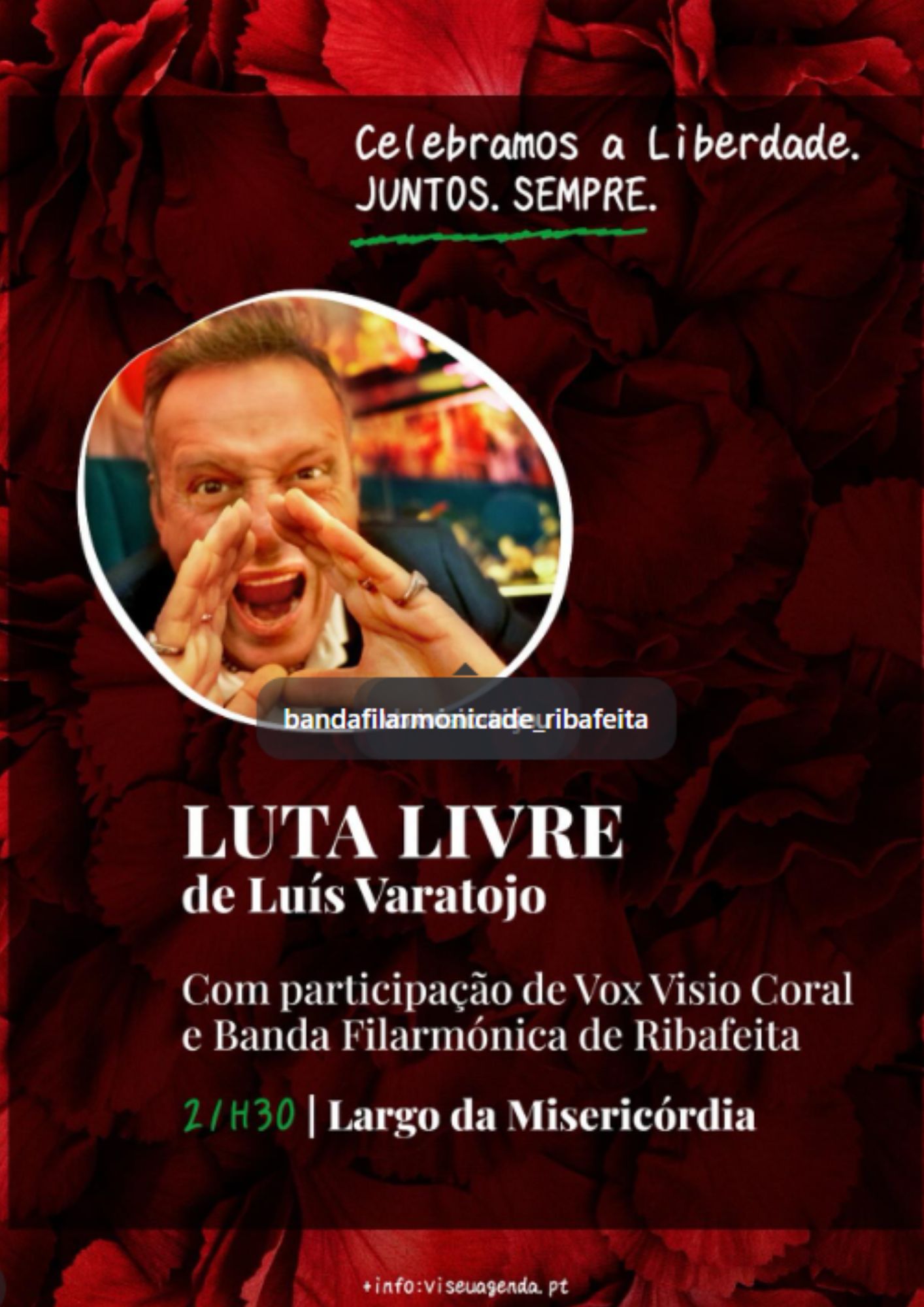 Evento gratuito de celebração do 25 de Abril em Viseu, às 21:30, no Largo da Misericórdia (Fonte das Três Bicas). |